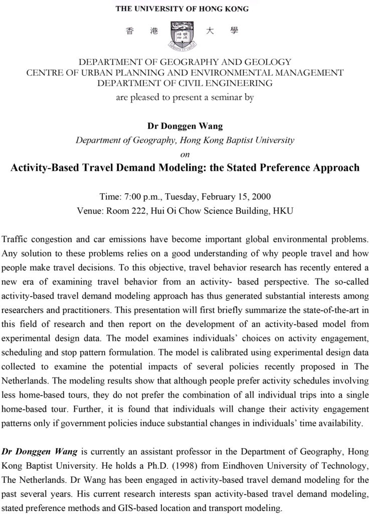 Traffic congestion and car emissions have become important global environmental problems. Any solution to these problems relies on a good understanding of why people travel and how people make travel decisions. To this objective, travel behavior research has recently entered a new era of examining travel behavior from an activity- based perspective. The so-called activity-based travel demand modeling approach has thus generated substantial interests among researchers and practitioners. This presentation will first briefly summarize the state-of-the-art in this field of research and then report on the development of an activity-based model from experimental design data. The model examines individuals’ choices on activity engagement, scheduling and stop pattern formulation. The model is calibrated using experimental design data collected to examine the potential impacts of several policies recently proposed in The Netherlands. The modeling results show that although people prefer activity schedules involving less home-based tours, they do not prefer the combination of all individual trips into a single home-based tour. Further, it is found that individuals will change their activity engagement patterns only if government policies induce substantial changes in individuals’ time availability.