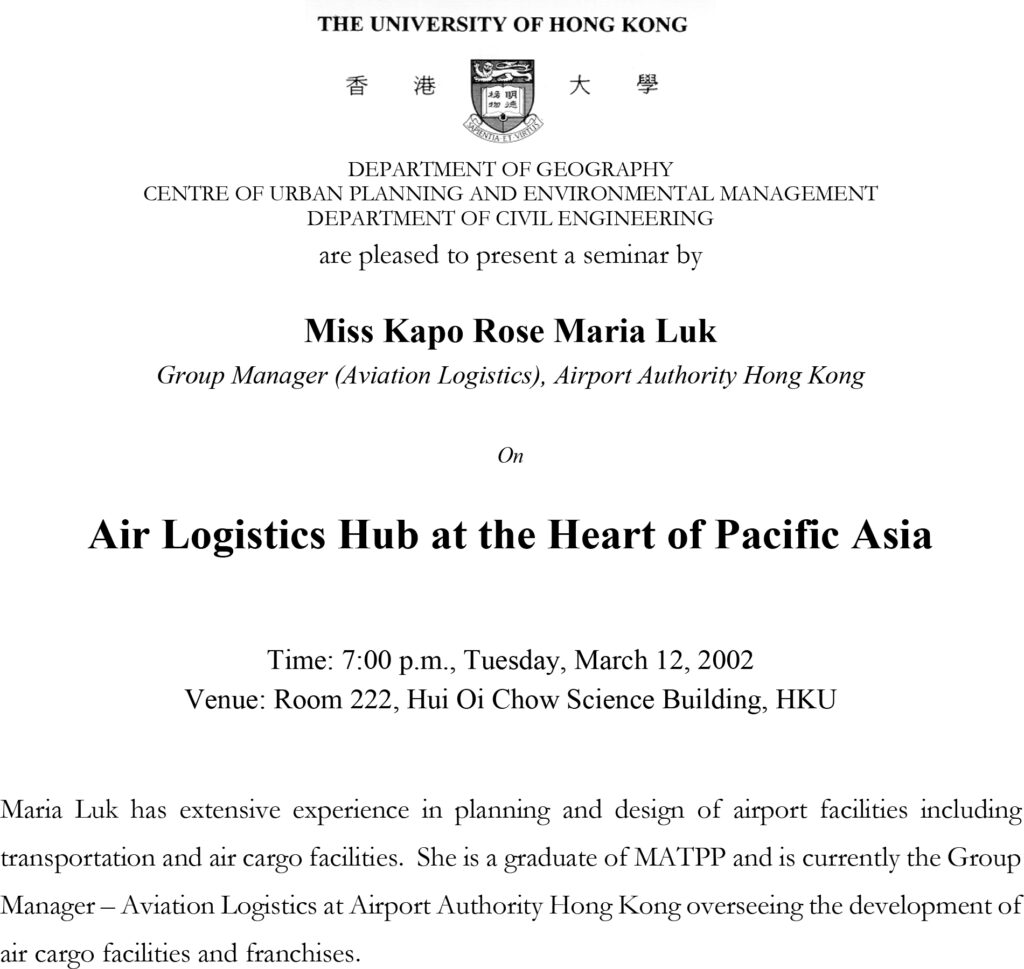 Group Manager (Aviation Logistics) Airport Authority Hong KongMaria Luk has extensive experience in planning and design of airport facilities including transportation and air cargo facilities. She is a graduate of MATPP and is currently the Group Manager – Aviation Logistics at Airport Authority Hong Kong overseeing the development of air cargo facilities and franchises.