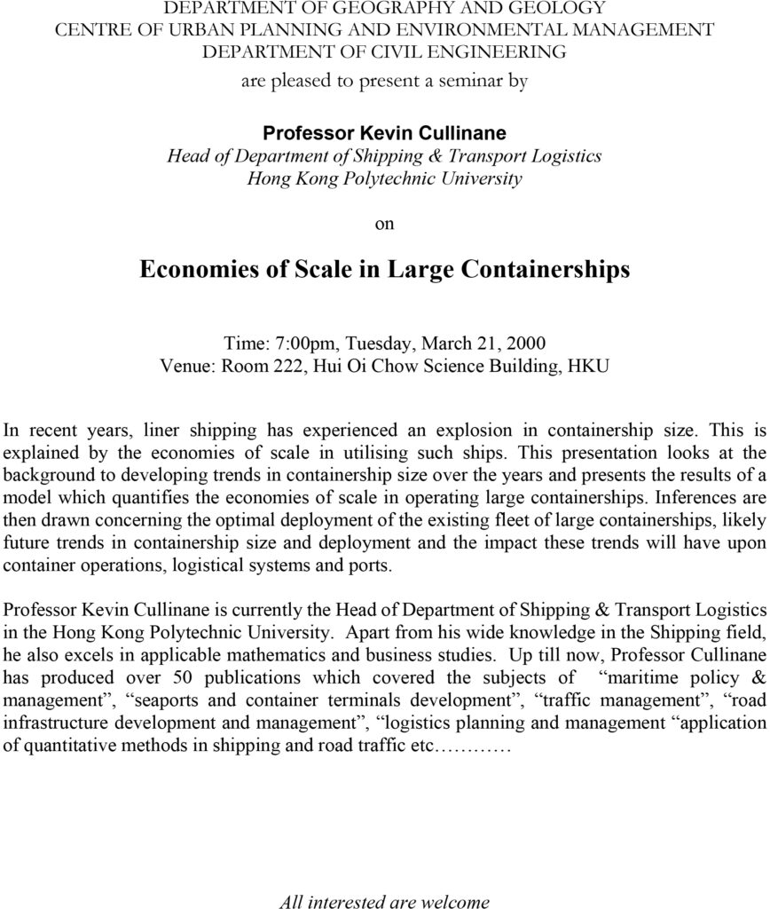 In recent years, liner shipping has experienced an explosion in containership size. This is explained by the economies of scale in utilising such ships. This presentation looks at the background to developing trends in containership size over the years and presents the results of a model which quantifies the economies of scale in operating large containerships. Inferences are then drawn concerning the optimal deployment of the existing fleet of large containerships, likely future trends in containership size and deployment and the impact these trends will have upon container operations, logistical systems and ports. Professor Kevin Cullinane is currently the Head of Department of Shipping & Transport Logistics in the Hong Kong Polytechnic University. Apart from his wide knowledge in the Shipping field, he also excels in applicable mathematics and business studies. Up till now, Professor Cullinane has produced over 50 publications which covered the subjects of “maritime policy & management”, “seaports and container terminals development”, “traffic management”, “road infrastructure development and management”, “logistics planning and management “application of quantitative methods in shipping and road traffic etc.