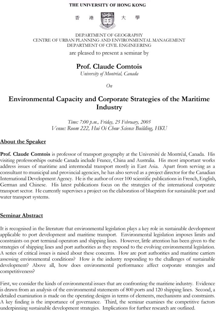 University of Montréal, CanadaProf. Claude Comtois is professor of transport geography at the Université de Montréal, Canada. His visiting professorships outside Canada include France, China and Australia. His most important works address issues of maritime and intermodal transport mostly in East Asia. Apart from serving as a consultant to municipal and provincial agencies, he has also served as a project director for the Canadian International Development Agency. He is the author of over 100 scientific publications in French, English, German and Chinese. His latest publications focus on the strategies of the international corporate transport sector. He currently supervises a project on the elaboration of blueprints for sustainable port and water transport systems.