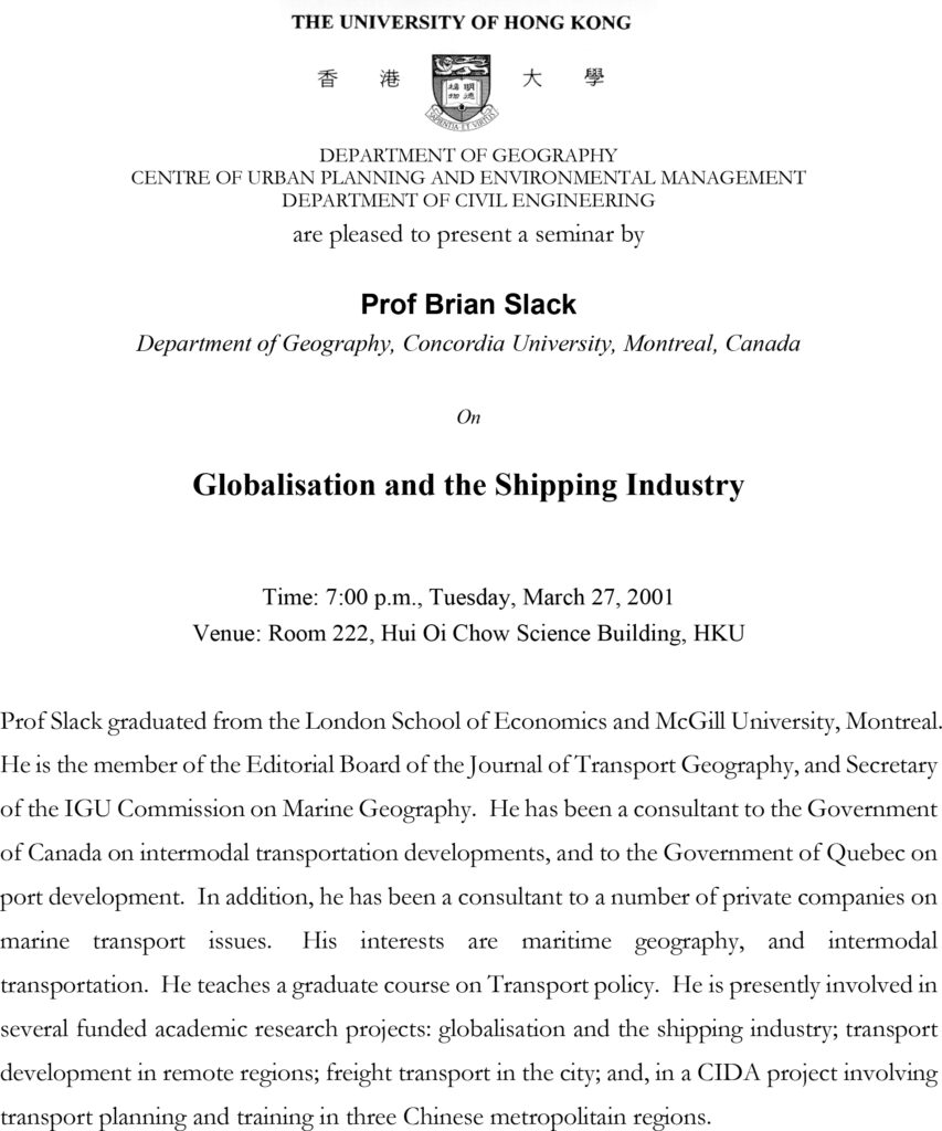 Concordia University Montreal, CanadaProf Slack graduated from the London School of Economics and McGill University, Montreal. He is the member of the Editorial Board of the Journal of Transport Geography, and Secretary of the IGU Commission on Marine Geography. He has been a consultant to the Government of Canada on intermodal transportation developments, and to the Government of Quebec on port development. In addition, he has been a consultant to a number of private companies on marine transport issues. His interests are maritime geography, and intermodal transportation. He teaches a graduate course on Transport policy. He is presently involved in several funded academic research projects: globalisation and the shipping industry; transport development in remote regions; freight transport in the city; and, in a CIDA project involving transport planning and training in three Chinese metropolitain regions.