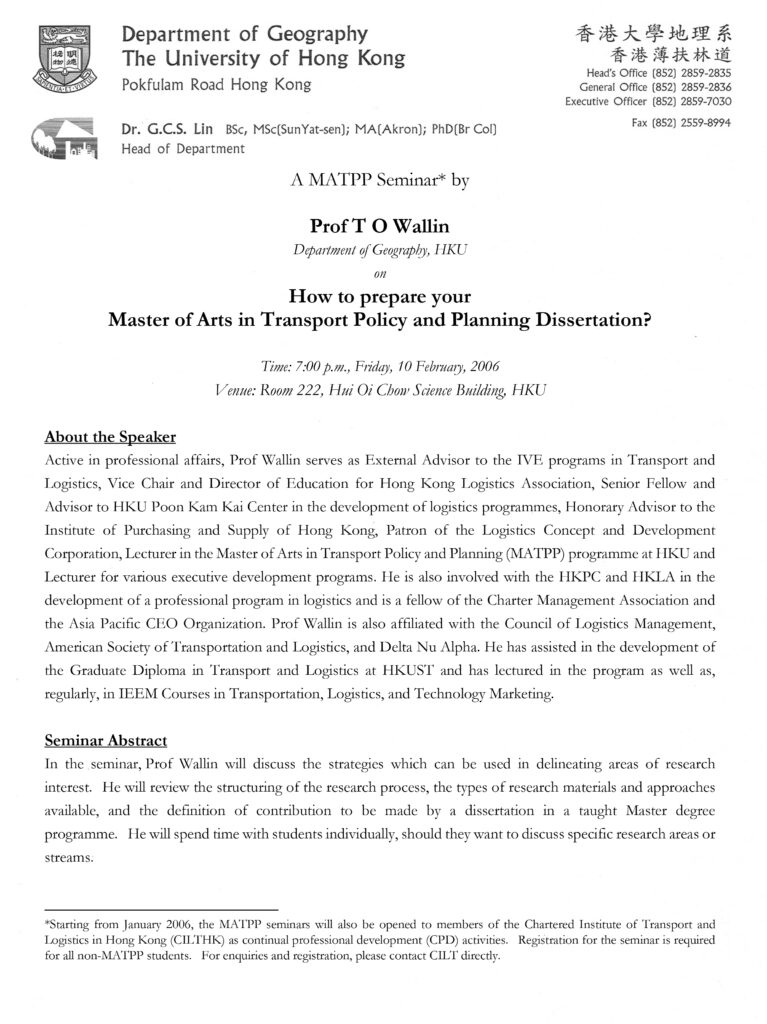 Honorary Professor, Department of Geography, HKUActive in professional affairs, Prof Wallin serves as External Advisor to the IVE programs in Transport and Logistics, Vice Chair and Director of Education for Hong Kong Logistics Association, Senior Fellow and Advisor to HKU Poon Kam Kai Center in the development of logistics programmes, Honorary Advisor to the Institute of Purchasing and Supply of Hong Kong, Patron of the Logistics Concept and Development Corporation, Lecturer in the Master of Arts in Transport Policy and Planning (MATPP) programme at HKU and Lecturer for various executive development programs. He is also involved with the HKPC and HKLA in the development of a professional program in logistics and is a fellow of the Charter Management Association and the Asia Pacific CEO Organization. Prof Wallin is also affiliated with the Council of Logistics Management, American Society of Transportation and Logistics, and Delta Nu Alpha. He has assisted in the development of the Graduate Diploma in Transport and Logistics at HKUST and has lectured in the program as well as, regularly, in IEEM Courses in Transportation, Logistics, and Technology Marketing.