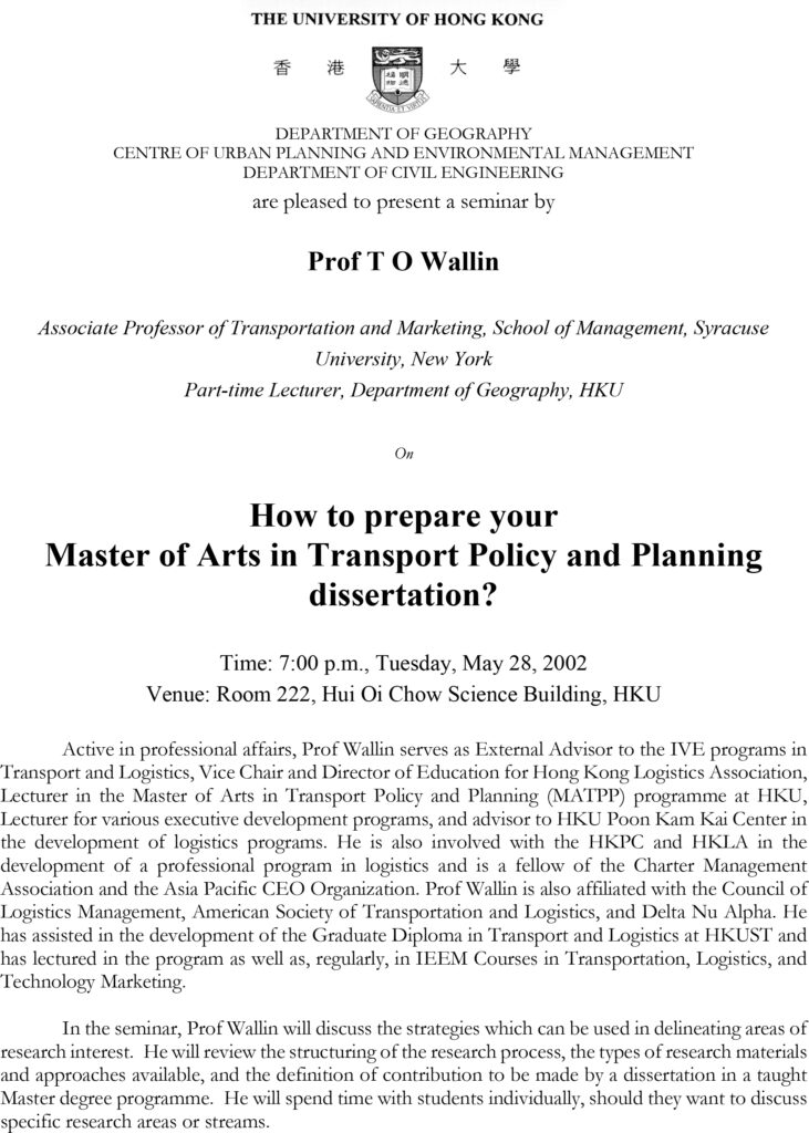 Visiting Professor, Department of Geography, HKUActive in professional affairs, Prof Wallin serves as External Advisor to the IVE programs in Transport and Logistics, Vice Chair and Director of Education for Hong Kong Logistics Association, Lecturer in the Master of Arts in Transport Policy and Planning (MATPP) programme at HKU, Lecturer for various executive development programs, and advisor to HKU Poon Kam Kai Center in the development of logistics programs. He is also involved with the HKPC and HKLA in the development of a professional program in logistics and is a fellow of the Charter Management Association and the Asia Pacific CEO Organization. Prof Wallin is also affiliated with the Council of Logistics Management, American Society of Transportation and Logistics, and Delta Nu Alpha. He has assisted in the development of the Graduate Diploma in Transport and Logistics at HKUST and has lectured in the program as well as, regularly, in IEEM Courses in Transportation, Logistics, and Technology Marketing. In the seminar, Prof Wallin will discuss the strategies which can be used in delineating areas of research interest. He will review the structuring of the research process, the types of research materials and approaches available, and the definition of contribution to be made by a dissertation in a taught Master degree programme. He will spend time with students individually, should they want to discuss specific research areas or streams.