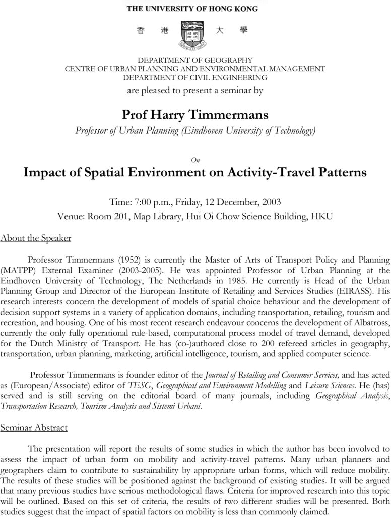 Professor of Urban Planning, Eindhoven University of TechnologyProfessor Timmermans (1952) is currently the Master of Arts of Transport Policy and Planning (MATPP) External Examiner (2003-2005). He was appointed Professor of Urban Planning at the Eindhoven University of Technology, The Netherlands in 1985. He currently is Head of the Urban Planning Group and Director of the European Institute of Retailing and Services Studies (EIRASS). His research interests concern the development of models of spatial choice behaviour and the development of decision support systems in a variety of application domains, including transportation, retailing, tourism and recreation, and housing. One of his most recent research endeavours concerns the development of Albatross, currently the only fully operational rule-based, computational process model of travel demand, developed for the Dutch Ministry of Transport. He has (co-)authored close to 200 refereed articles in geography, transportation, urban planning, marketing, artificial intelligence, tourism, and applied computer science.