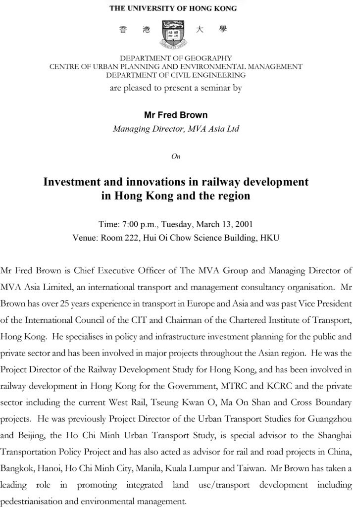 Chief Executive Officer MVAMr Fred Brown is Chief Executive Officer of The MVA Group and Managing Director of MVA Asia Limited, an international transport and management consultancy organisation. Mr Brown has over 25 years experience in transport in Europe and Asia and was past Vice President of the International Council of the CIT and Chairman of the Chartered Institute of Transport, Hong Kong. He specialises in policy and infrastructure investment planning for the public and private sector and has been involved in major projects throughout the Asian region. He was the Project Director of the Railway Development Study for Hong Kong, and has been involved in railway development in Hong Kong for the Government, MTRC and KCRC and the private sector including the current West Rail, Tseung Kwan O, Ma On Shan and Cross Boundary projects. He was previously Project Director of the Urban Transport Studies for Guangzhou and Beijing, the Ho Chi Minh Urban Transport Study, is special advisor to the Shanghai Transportation Policy Project and has also acted as advisor for rail and road projects in China, Bangkok, Hanoi, Ho Chi Minh City, Manila, Kuala Lumpur and Taiwan. Mr Brown has taken a leading role in promoting integrated land use/transport development including pedestrianisation and environmental management.