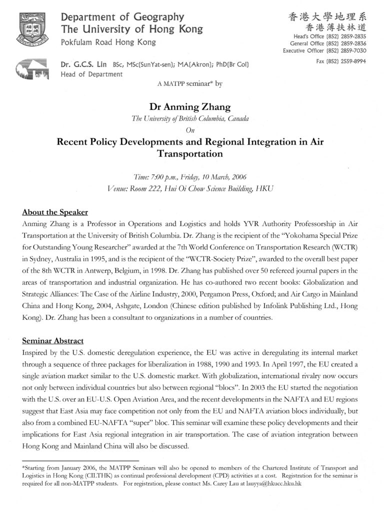 Inspired by the U.S. domestic deregulation experience, the EU was active in deregulating its internal market through a sequence of three packages for liberalization in 1988, 1990 and 1993. In April 1997, the EU created a single aviation market similar to the U.S. domestic market. With globalization, international rivalry now occurs not only between individual countries but also between regional “blocs”. In 2003 the EU started the negotiation with the U.S. over an EU-U.S. Open Aviation Area, and the recent developments in the NAFTA and EU regions suggest that East Asia may face competition not only from the EU and NAFTA aviation blocs individually, but also from a combined EU-NAFTA “super” bloc. This seminar will examine these policy developments and their implications for East Asia regional integration in air transportation. The case of aviation integration between Hong Kong and Mainland China will also be discussed.