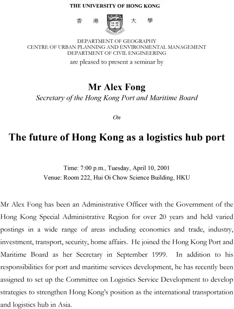 Secretary of the Hong Kong Port and Maritime BoardMr Alex Fong has been an Administrative Officer with the Government of the Hong Kong Special Administrative Region for over 20 years and held varied postings in a wide range of areas including economics and trade, industry, investment, transport, security, home affairs. He joined the Hong Kong Port and Maritime Board as her Secretary in September 1999. In addition to his responsibilities for port and maritime services development, he has recently been assigned to set up the Committee on Logistics Service Development to develop strategies to strengthen Hong Kong’s position as the international transportation and logistics hub in Asia.