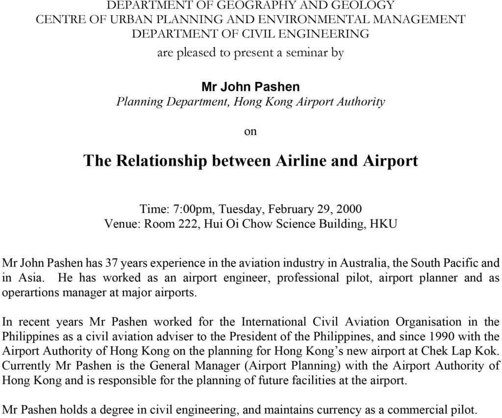 In recent years Mr Pashen worked for the International Civil Aviation Organisation in the Philippines as a civil aviation adviser to the President of the Philippines, and since 1990 with the Airport Authority of Hong Kong on the planning for Hong Kong’s new airport at Chek Lap Kok. Currently Mr Pashen is the General Manager (Airport Planning) with the Airport Authority of Hong Kong and is responsible for the planning of future facilities at the airport.