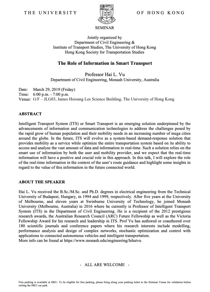 Department of Civil Engineering, Monash University, AustraliaHai L. Vu received the B.Sc./M.Sc. and Ph.D. degrees in electrical engineering from the Technical University of Budapest, Hungary, in 1994 and 1999, respectively. After five years at the University of Melbourne, and eleven years at Swinburne University of Technology, he joined Monash University (Melbourne, Australia) in 2016 where he currently is Professor of Intelligent Transport System (ITS) in the Department of Civil Engineering. He is a recipient of the 2012 prestigious research awards, the Australian Research Council (ARC) Future Fellowship as well as the Victoria Fellowship Award for his research and leadership in ITS. Prof Vu has authored or coauthored over 180 scientific journals and conference papers where his research interests include modelling, performance analysis and design of complex networks, stochastic optimization and control with applications to connected autonomous vehicles and intelligent transportation. More info can be found at https://www.monash.edu/engineering/lehaivu