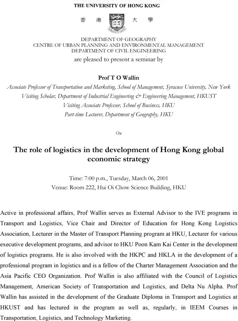 Visiting Professor, Department of Geography, HKUActive in professional affairs, Prof Wallin serves as External Advisor to the IVE programs in Transport and Logistics, Vice Chair and Director of Education for Hong Kong Logistics Association, Lecturer in the Master of Transport Planning program at HKU, Lecturer for various executive development programs, and advisor to HKU Poon Kam Kai Center in the development of logistics programs. He is also involved with the HKPC and HKLA in the development of a professional program in logistics and is a fellow of the Charter Management Association and the Asia Pacific CEO Organization. Prof Wallin is also affiliated with the Council of Logistics Management, American Society of Transportation and Logistics, and Delta Nu Alpha. Prof Wallin has assisted in the development of the Graduate Diploma in Transport and Logistics at HKUST and has lectured in the program as well as, regularly, in IEEM Courses in Transportation, Logistics, and Technology Marketing.