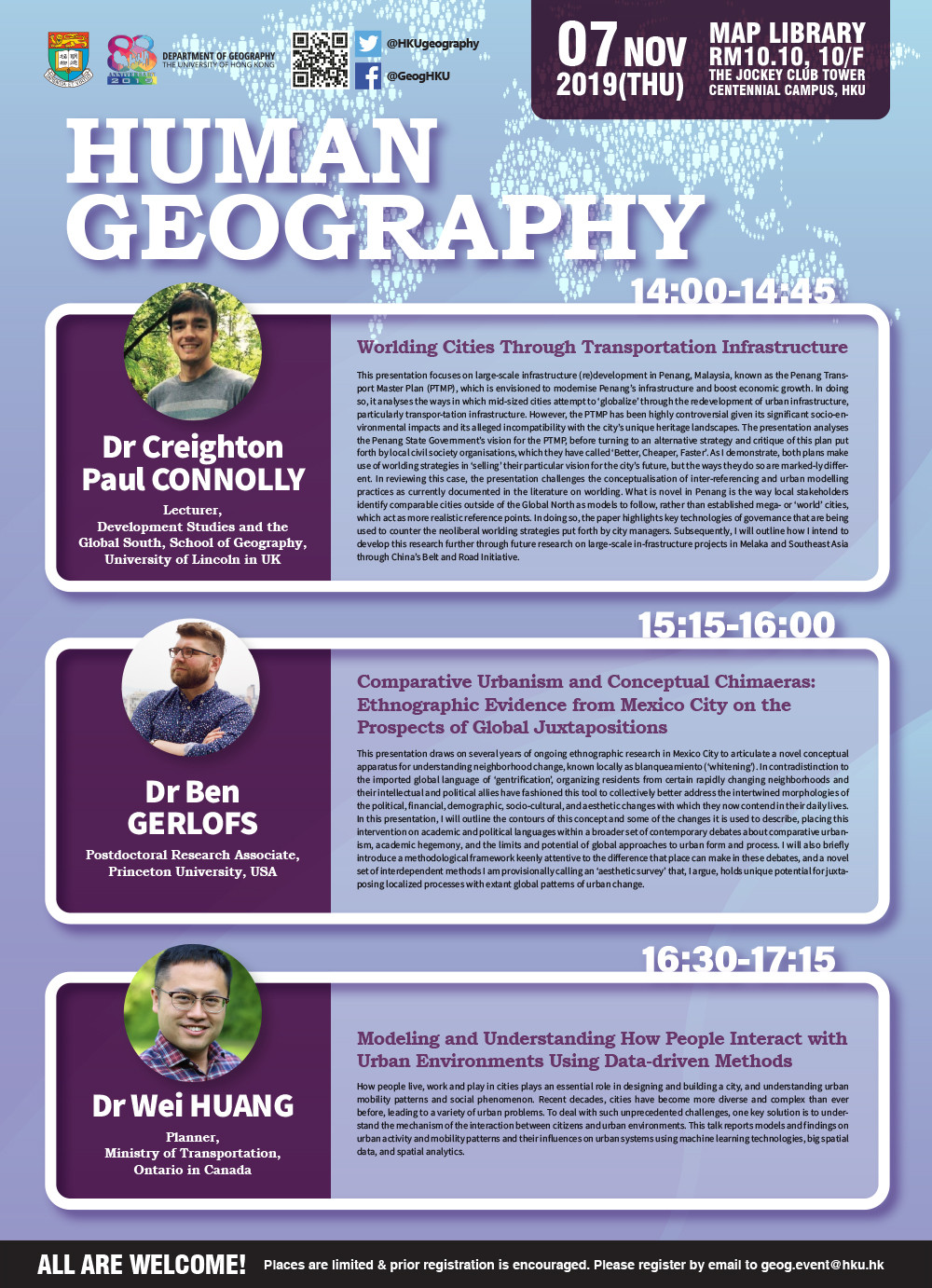 This presentation focuses on large-scale infrastructure (re)development in Penang, Malaysia, known as the Penang Transport Master Plan (PTMP), which is envisioned to modernise Penang’s infrastructure and boost economic growth. In doing so, it analyses the ways in which mid-sized cities attempt to ‘globalize’ through the redevelopment of urban infrastructure, particularly transpor-tation infrastructure. However, the PTMP has been highly controversial given its significant socio-environmental impacts and its alleged incompatibility with the city’s unique heritage landscapes. The presentation analyses the Penang State Government’s vision for the PTMP, before turning to an alternative strategy and critique of this plan put forth by local civil society organisations, which they have called ‘Better, Cheaper, Faster’. As I demonstrate, both plans make use of worlding strategies in ‘selling’ their particular vision for the city’s future, but the ways they do so are marked-ly different. In reviewing this case, the presentation challenges the conceptualisation of inter-referencing and urban modelling practices as currently documented in the literature on worlding. What is novel in Penang is the way local stakeholders identify comparable cities outside of the Global North as models to follow, rather than established mega- or ‘world’ cities, which act as more realistic reference points. In doing so, the paper highlights key technologies of governance that are being used to counter the neoliberal worlding strategies put forth by city managers. Subsequently, I will outline how I intend to develop this research further through future research on large-scale in-frastructure projects in Melaka and Southeast Asia through China’s Belt and Road Initiative.